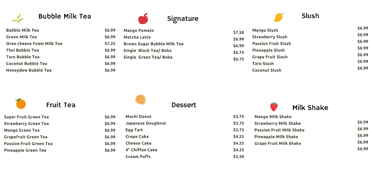 The menu at Hi T House offers a delightful variety of beverages and desserts that cater to all tastes. Their Bubble Milk Tea selection includes popular options like Bubble Milk Tea and Green Milk Tea, with the indulgent Oreo Cheese Foam Milk Tea adding a unique twist. For those craving something fruity, the Fruit Tea section shines with options such as Super Fruit Green Tea, Strawberry Green Tea, and Mango Green Tea, providing refreshing and vibrant flavors. The Signature drinks are equally appealing, featuring crowd favorites like Mango Pomelo and the decadent Brown Sugar Bubble Milk Tea. For dessert lovers, the menu features treats such as Mochi Donut, Japanese Doughnut, and Egg Tart, as well as the indulgent Crepe Cake and Cheese Cake. The Milk Shake offerings, including Mango Milk Shake and Strawberry Milk Shake, promise a creamy, refreshing experience, while the Slush varieties like Mango Slush and Passion Fruit Slush provide a perfect cool-down. The selection is rounded off with delightful fruity options in both the slush and others sections, making Hi T House an ideal spot for anyone looking to enjoy a diverse range of delicious and satisfying drinks and treats.
